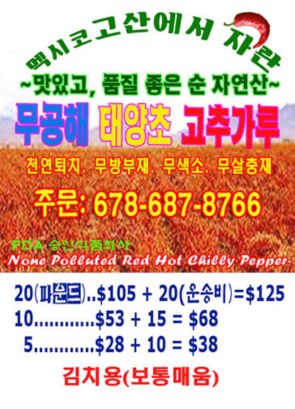 12월에 수확한 멕시코 고산 무공해 태양초 고추가루! 작성자 정보 riverflow 작성 작성일 2025.04.13 07:47 컨텐츠 정보 835 조회 목록 본문 12월에 수확한 멕시코 고산 무공해 태양초 고추가루! 관련자료 이전 새끼 진돗개 파실 분 연락 부탁드립니다. 작성일 2025.04.15 13:44 다음 압박 스타킹 작성일 2025.04.12 10:25 댓글 0 등록된 댓글이 없습니다. 로그인한 회원만 댓글 등록이 가능합니다. 목록