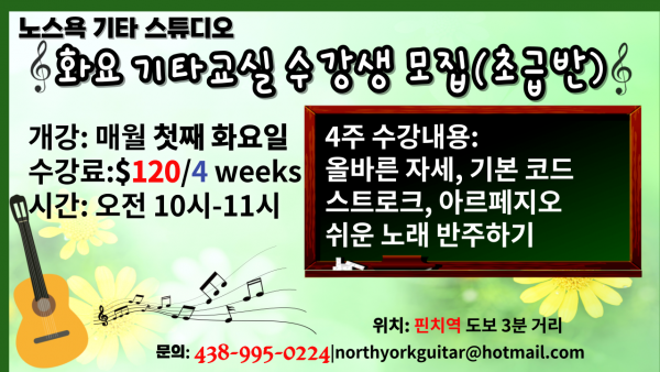노스욕 기타 스튜디오 화요 기타교실 수강생 모집합니다. (초급반)