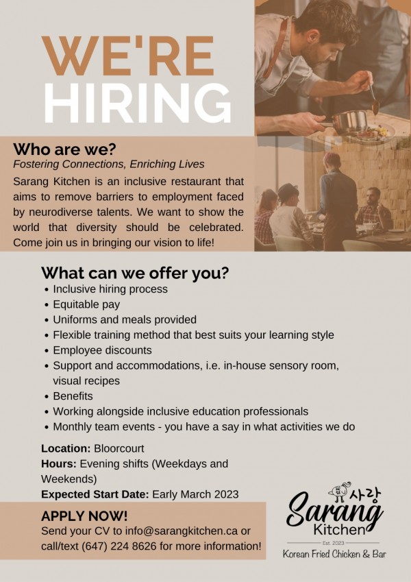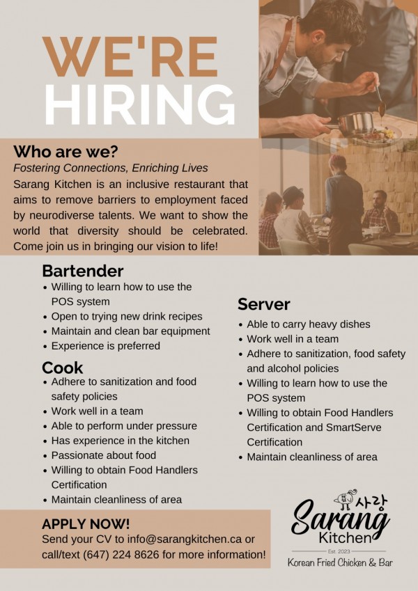 다운타운 Sarangkitchen 식당에서 서버/요리사 모십니다. 작성자 정보 사랑키친 작성 작성일 2023.03.01 12:32 컨텐츠 정보 2,701 조회 목록 본문 한국치킨 & Bar (1056 bloor st west) Living wage 드립니다. 6개월 후에 Benefits 있습니다. 식당 오픈시간은 오후 5시입니다. 관심있는분 연락주시기 바랍니다. 김동현 6474824280 관련자료 링크 https://sarangkitchen.ca/ 5351 회 연결 https://instagram.com/sarangkitchento?igshid=ZDdkNTZiNTM= 6214 회 연결 이전 Genesis Markham에서 함께하실 Genesis Experienc 작성일 2023.03.03 08:57 다음 단순 헬퍼 구합니다. 풀타임 또는 파트타임 가능. 운전자 우대. Reti 작성일 2023.02.28 09:02 댓글 0 등록된 댓글이 없습니다. 로그인한 회원만 댓글 등록이 가능합니다. 목록
