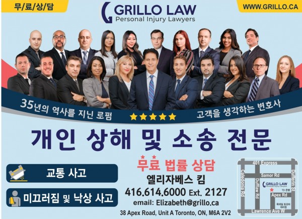 Grillo Law - 토론토 개인 상해 및 소송 전문 변호사 작성자 정보 관리자 작성 작성일 2023.09.01 14:16 컨텐츠 정보 936 조회 목록 본문 35년의 역사를 지닌 로펌.고객을 생각하는 변호사.개인 상해 및 소송 전문○ 교통사고○ 미끄러짐 및 낙상 사고무료 법률 상담.416-614-6000 (2127) 엘리자베스 킴 관련자료 링크 http://www.grillo.ca 289 회 연결 이전 SK 히팅 & 쿨링 작성일 2023.10.06 14:19 다음 김씨네 맛있는 김 작성일 2023.08.28 15:27 댓글 0 등록된 댓글이 없습니다. 로그인한 회원만 댓글 등록이 가능합니다. 목록