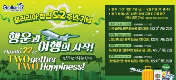토론토 한인마트 갤러리아슈퍼마켓이 창립 22주년을 맞아 고객들의 성원에 보답하고자 특별한 감사 이벤트를 진행하고 있다. 11월 14일부터 12월 11일까지 4주간 진행되는 ‘투게더 투 해피니스(Together to Happiness)’ 이벤트는 매주 해외 여행 경품과 상품권을 증정하는 고객 참여형 프로모션으로, 한 달간 다채롭게 펼쳐질 예정이다.