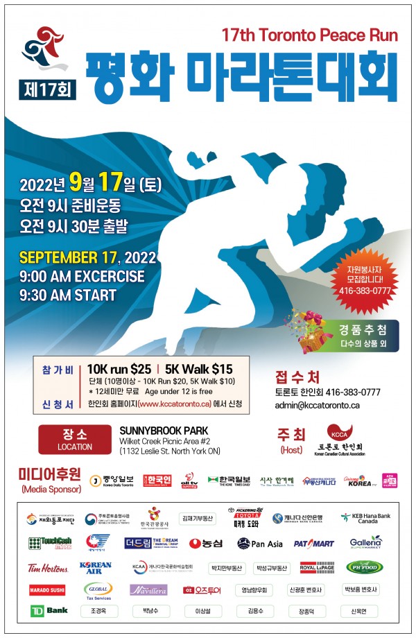 한인의 날 기념 제17회 평화 마라톤 대회 (Toronto Peace Run & Walk) 작성자 정보 관리자 작성 작성일 2022.08.26 04:10 컨텐츠 정보 881 조회 목록 본문 행사명: 한인의 날 기념 제17회 평화 마라톤 대회 (Toronto Peace Run & Walk)일 시: 2021년 9월 17일(토) 오전 9시 출발장 소: Sunnybrook Park: Picnic Area #2경기종목: 10km Run (달리기) & 5km Walk (걷기) 참가비: 10km Run 개인 $25/ 단체 $20 5km Walk 개인 $15/ 단체 $10 * 단체는 10인 이상이며, 만 12세 미만은 무료로 참여 가능주 최: 토론토 한인회●대회장: 김정희●준비위원장: 김재기 ●대회 총괄 본부장: 박진천 관련자료 링크 http://www.koreancentre.on.ca/ 192 회 연결 이전 [보도] 플레이어 챔피언쉽 컬링 대회 안내| Player's Championship Curling Tournament in Toronto 작성일 2023.04.10 14:44 다음 2022 제 2 회 한인 가을 축제 작성일 2022.08.19 00:39 댓글 0 등록된 댓글이 없습니다. 로그인한 회원만 댓글 등록이 가능합니다. 목록